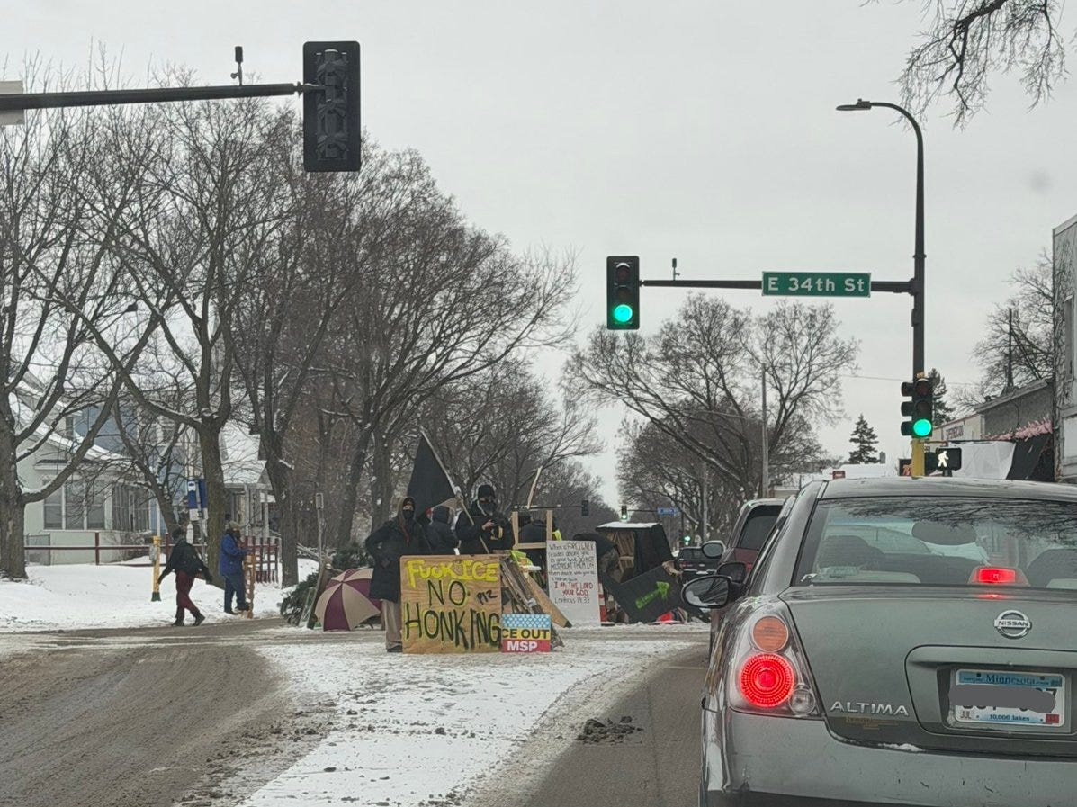 Say, for example, a black man drives up, doesn’t appreciate being subject to an unlawful stop, and decides to give the protesters a piece of his mind. The conversation escalates, the protesters refuse to let him pass, then the driver gets out of a the car and a fracas ensues. In a worst-case scenario, an armed protester, similar to Alex Pretti becomes involved. Maybe the driver is armed, too. Imagine the gun goes off. What then? How will the protesters justify this? More important, how would Mayor Jacob Frey and Governor Tim Walz explain their complete negligence leading to the tragic outcome?
