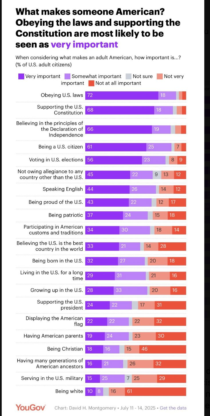 The poll graphic is hilarious. The only 2 things a majority of people DON'T think are important for being an American are "being white" and "being Christian". Yet both these likely the most common, bare-minimum criteria accepted at the founding of the country.