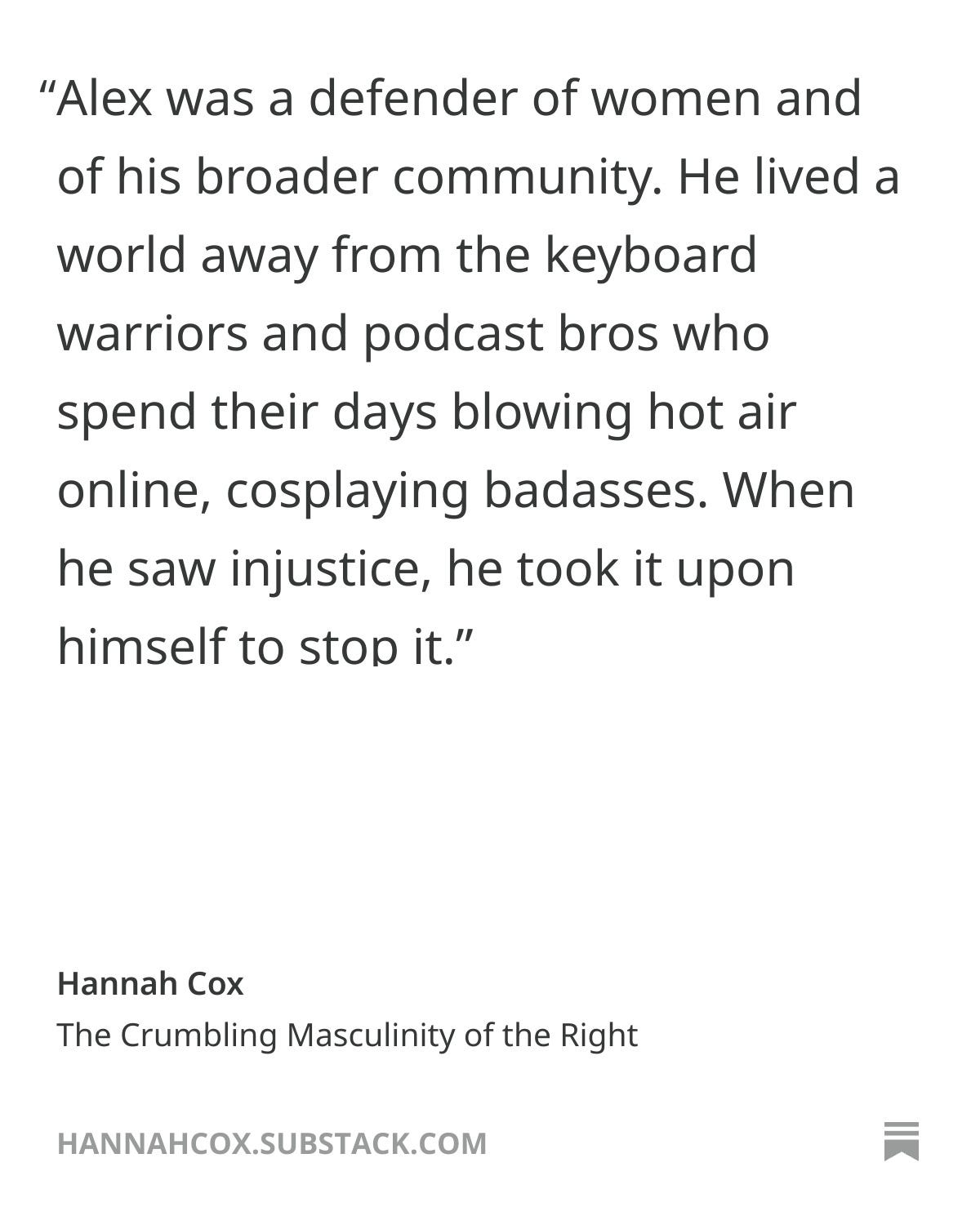 It’s easy to fantasize about dying for a cause when you’re utterly incapable of violence. The fact is, Cox and other women like her will sacrifice absolutely nothing for their cause. If they end up getting killed, it won’t be out of heroism, but out of delusion. By honoring people like Alex Pretti and praising his actions, all they’re showing is that they expect men to still do the fighting and dying on their behalf. Their expectation of men is that they become radicalized to take up their causes and sacrifice themselves the way Pretti did.