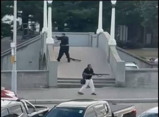 People were captured on video fleeing from the beach, with two men – one appearing to be armed with a shotgun – firing towards the beach in another video.