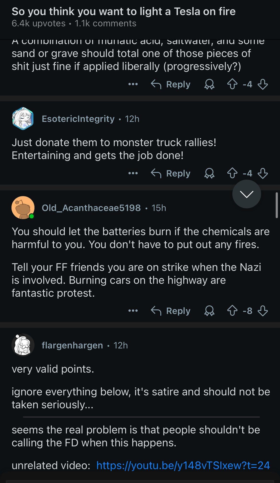Still not convinced? Read this X thread depicting how users responded on Reddit, a leftist hotbed, to a firefighter warning against setting Teslas alight.
