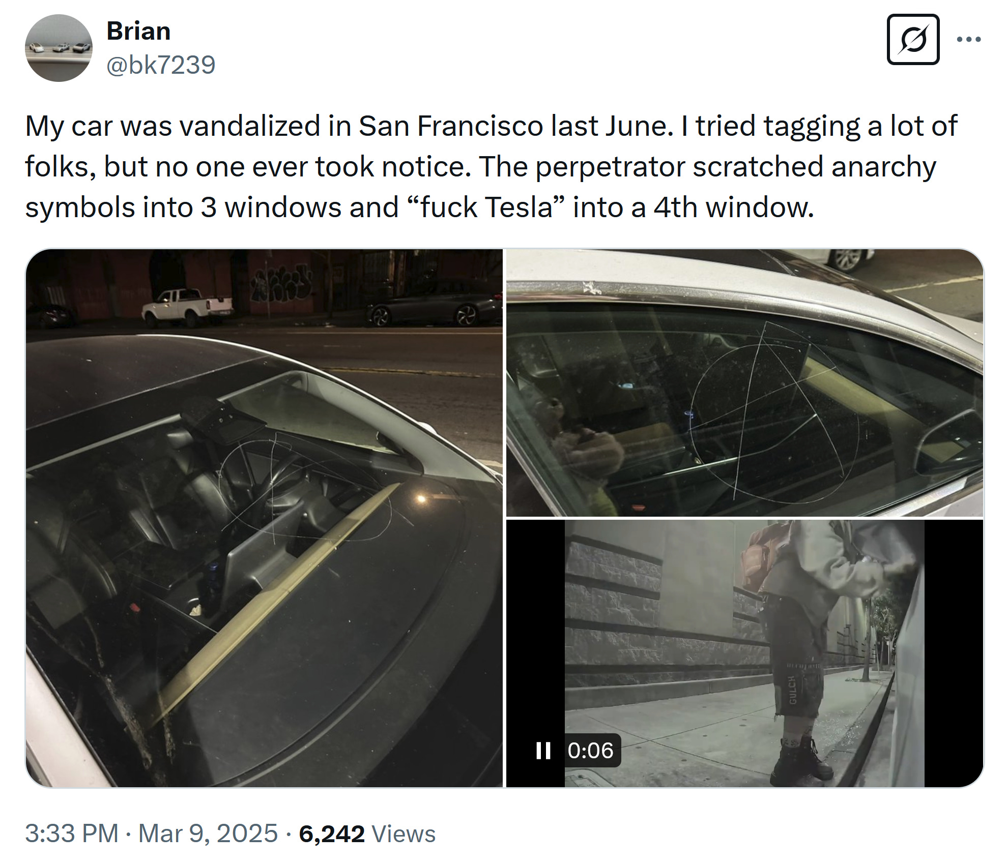 , that we should anticipate a wave of left-wing terrorism in the coming years:Despite the furor of these anti-Tesla demonstrations, they still pale in comparison to the scale of anti-Trump protests in 2017. There may be some sort of Resistance, but it’s not the mass phenomenon that it once was in the first Trump term. But the violence could be a preview of a new wave of domestic terror in America. Some fear that “left-wing underground terror waves are coming” and it will have significant social support. But these terrorists won’t belong to any groups or real movements. They might not even have much of a clear ideology besides hating Trump and the establishment. They will be lone wolves radicalized by the media and the internet into violence. It will be hard for authorities to do much about them.